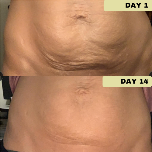 At first I have to say I was very, very skeptical. Nowadays products make all of these fantastic claims but never deliver. I have a lot of sagging, hanging skin in addition to stretch marks. I had two c sections years ago and had not kept up with my tummy at all. I hide it under clothes and tuck it in my underwear. I am on a fitness journey so I decided to really focus on shrinking my core and tightening the loose skin on my belly. I searched Amazon and this product came up. It had almost 20k reviews so I figured it must be good. I tried it and it is very nourishing and leaves your skin smooth. I have attached photos. The photo on the right is 7/25 and the left is 10/25. There is a difference for sure. My skin is tighter, smoother and my stretch marks are less pronounced. I will reorder as many times as necessary!